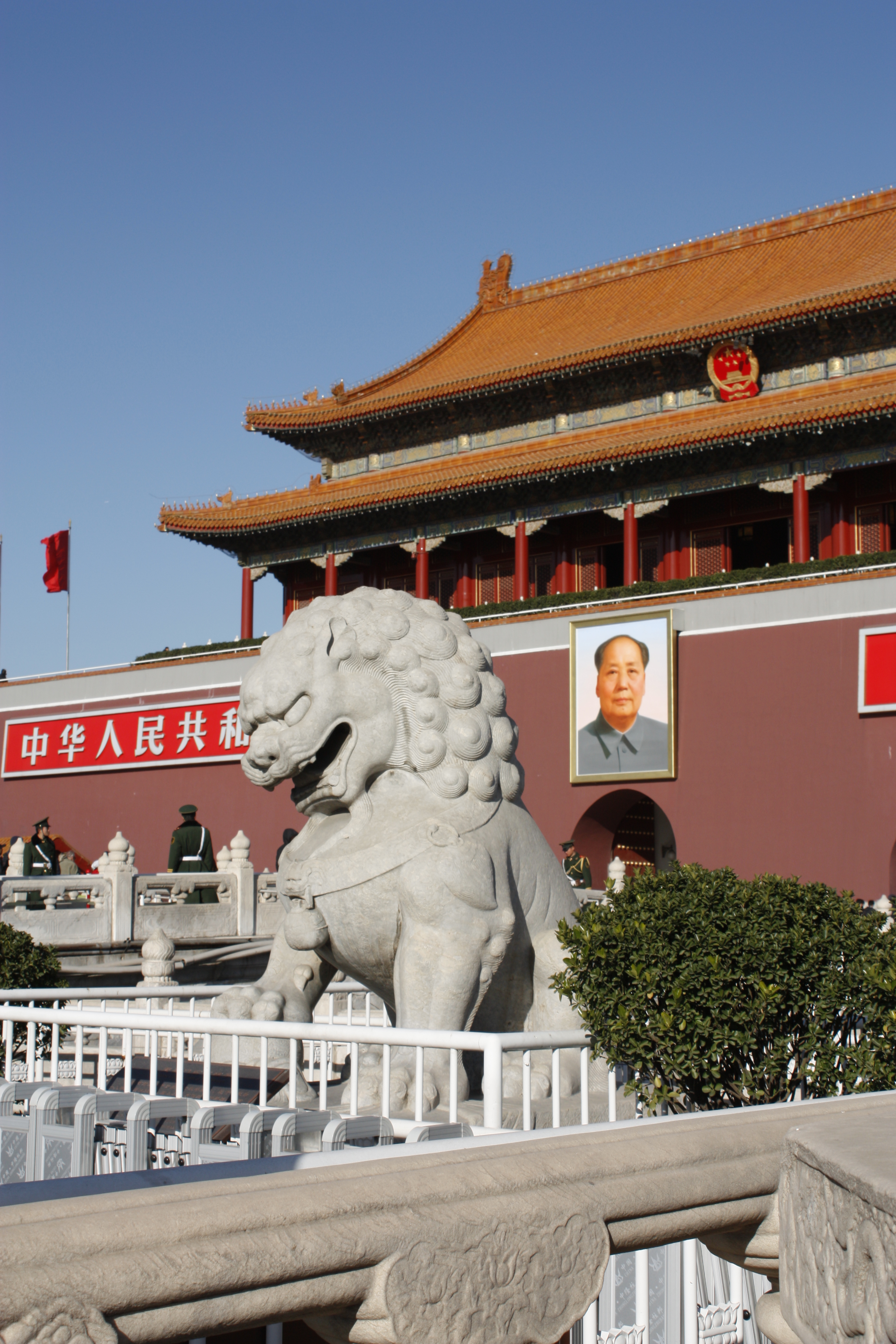 Himmelska Fridens Port utgör med sin massiva stenfasad ingången till Förbjudna Staden. Mot en terrakottaröd bakgrund vilar ett gigantiskt porträtt av Mao Zedong – folkrepubliken Kinas grundare. Vår guide berättar att man varje år gör om porträttet för att förhindra att hårda vindar, regn och sol tar med sig färgen och låter ansiktet blekna. Vi rör oss sakta mot ingången. Förväntningarna och nyfikenheten stiger ju närmare vi kommer denna för inte så länge sedan förbjudna plats.