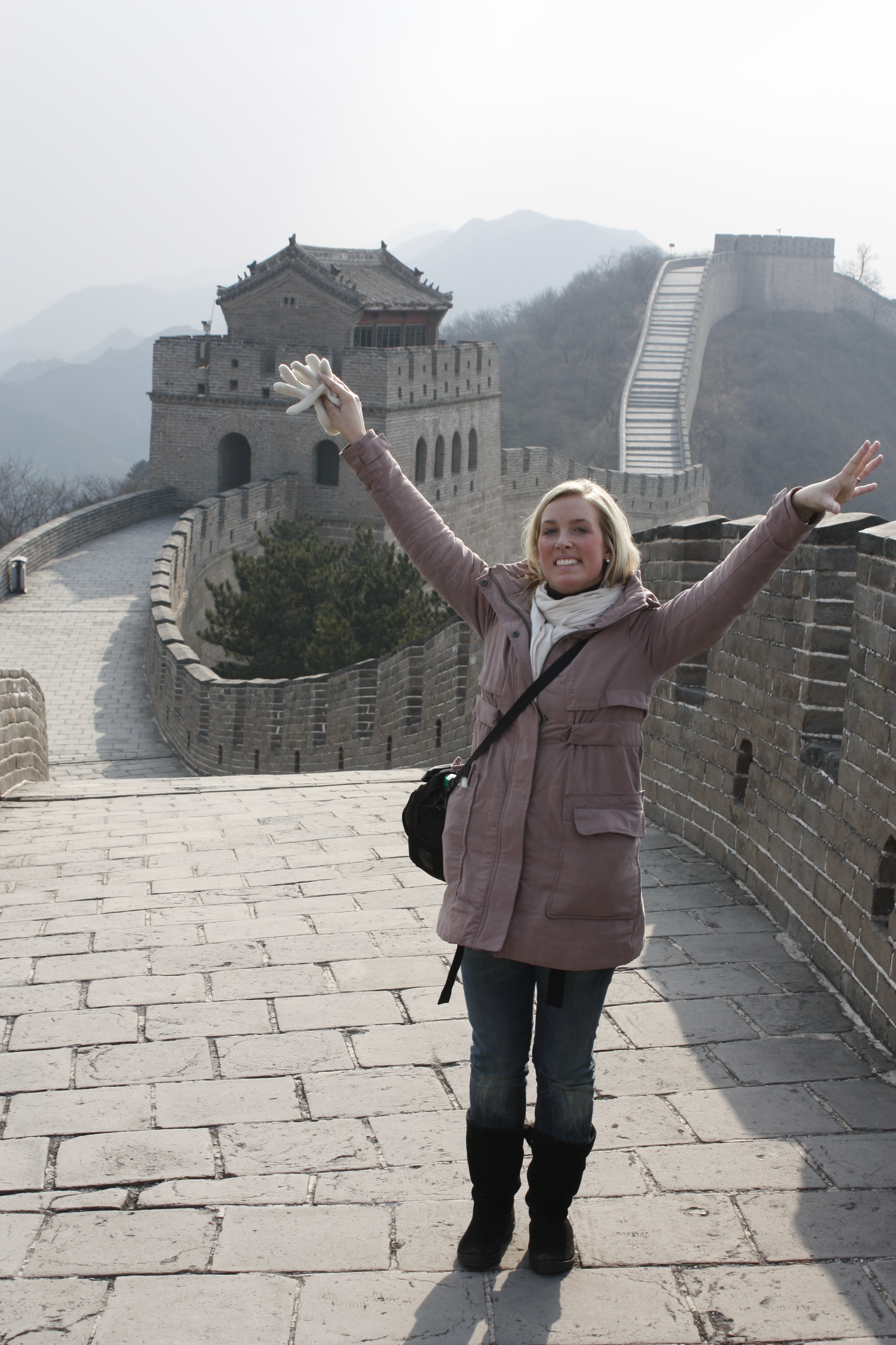 Badaling är den turisttätaste och mest lättillgängliga delen av muren. När vi kliver upp på första trappavsatsen möts vi av ett vägskäl. Antingen kan vi ta till höger, som är planare och som 95% av turisterna väljer, eller så kan vi ta till till vänster och vara näst intill ensamma. Vi väljer att inte följa strömmen. Den vänstra delen visar sig vara mycket brant på sina ställen vilket förklarar avsaknaden av folk. Men trots att det stundvis är enormt ansträngande att kämpa sig uppför så är det alla gånger värt den exklusiva känslan av att vara ensam ”on top of the world”.