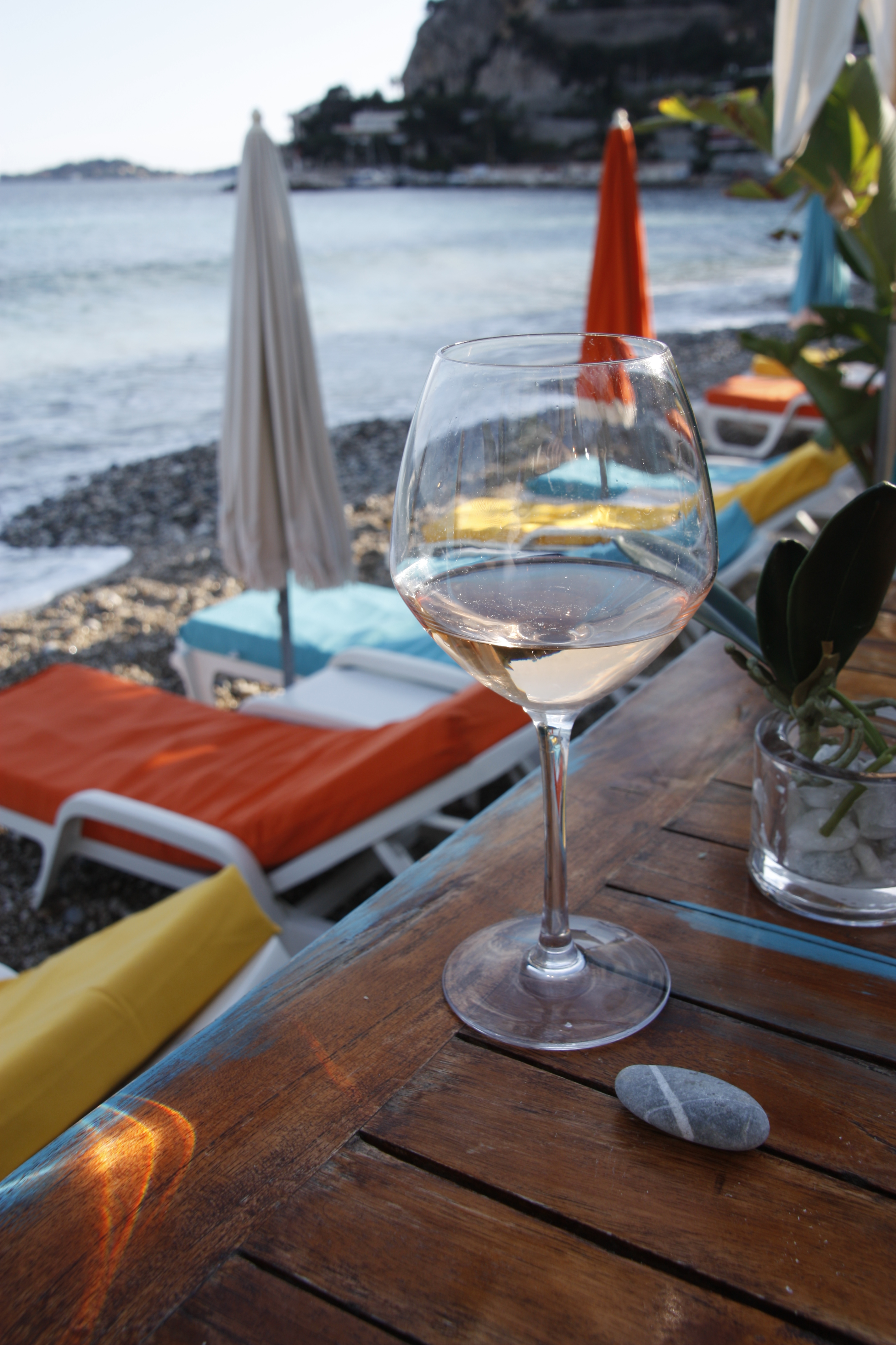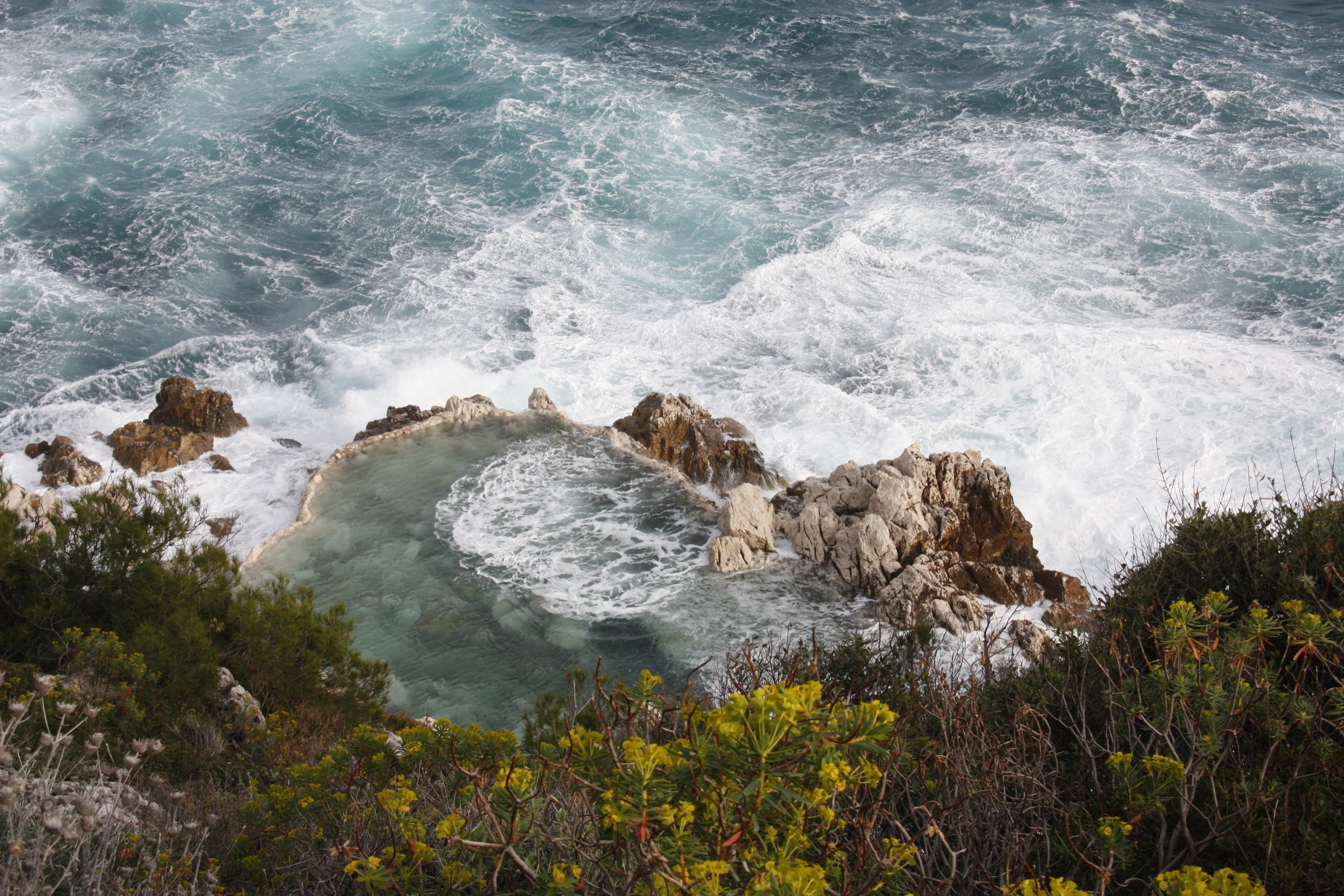 Alldeles utanför murarna slår vågorna från havet och i en skyddad liten bukt hittar vi en liten sandstrand där flertalet familjer samlats för att ta en fika tillsammans i solen och andas frisk havsluft. Tar man sig en bit längre bort längs med utsidan av muren ser man bort till den mer livliga tvillingstaden Juan Les Pins med sin långa breda sandstrand.
