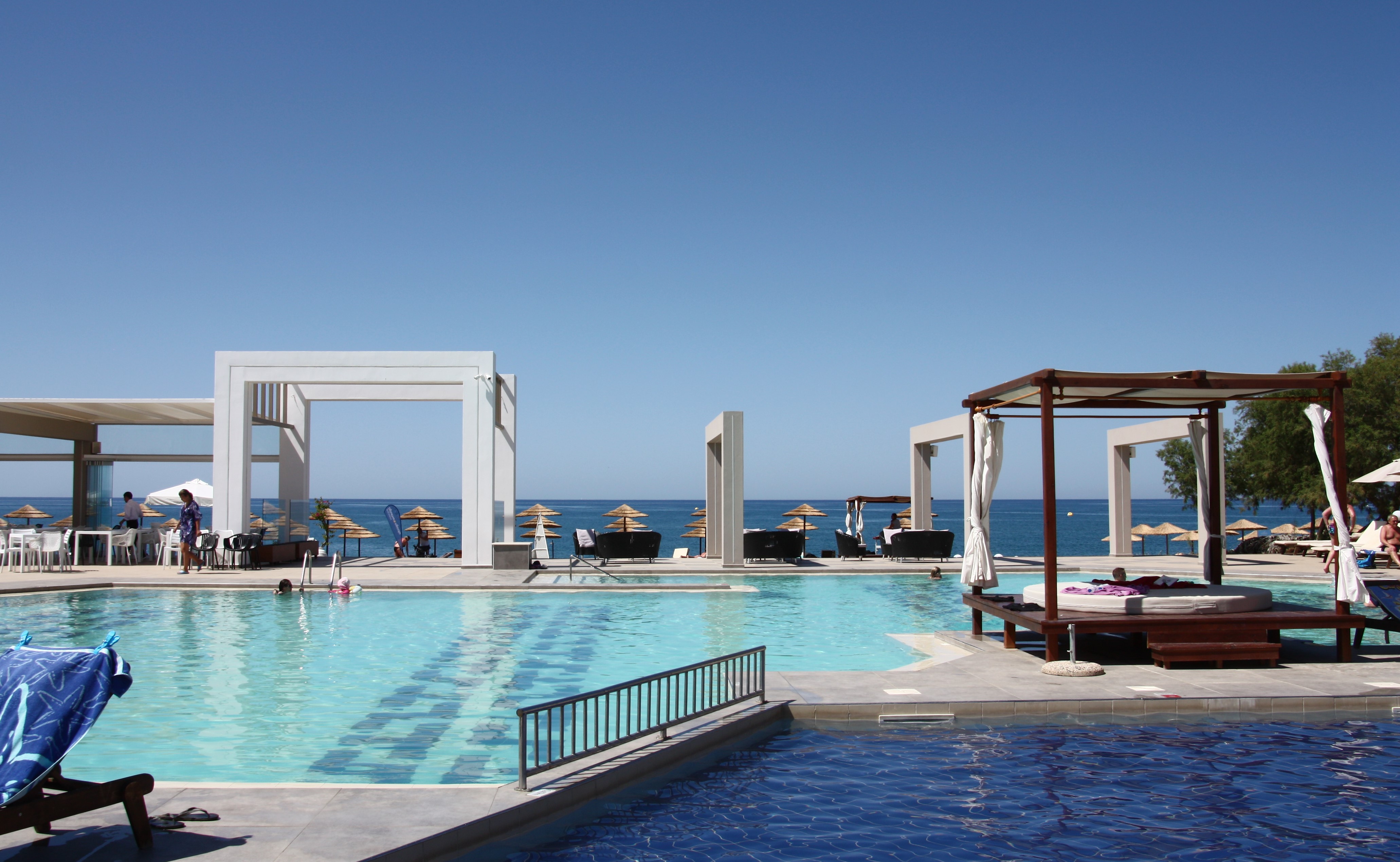 Det kan lätt framkalla tristess och otålighet, men det är ändå något visst med själva transporten till resmålet. Känslan av att på några ynka timmar förflytta sig genom tid och rum är näst intill surrealistisk och i bland svår att greppa. Denna känsla infinner sig när vi efter 45 minuters busstransfer från Chanias flygplats kliver in genom de glasade portarna på Santa Helena Beach. Bara några timmar tidigare stod vi lite lätt yrvakna och halvfrusna, trängandes med hundratals andra, på Landvetter flygplats. Nu möts vi av flera nyanser av turkos som badar i solljus. Befrielse känns som ett passande ord. Trots att hotellet är placerat mitt på huvudgatan i det högljudda, lite mindre charmiga, Platanias så har man innanför väggarna lyckats bevara ett otroligt lugn och en smakfull elegans, utan att för den sakens skull vara det minsta stelt eller överdådigt. Att hotellet är nyrenoverat märks och det svala avskalade som brukar tilltala oss skandinaver dominerar. Detta i kombination med rätt detaljer på rätt ställen skapar en väldigt välkomnande och trivsam atmosfär. Här behövs ingen vidare presentation, vi gillar oss från första stund.