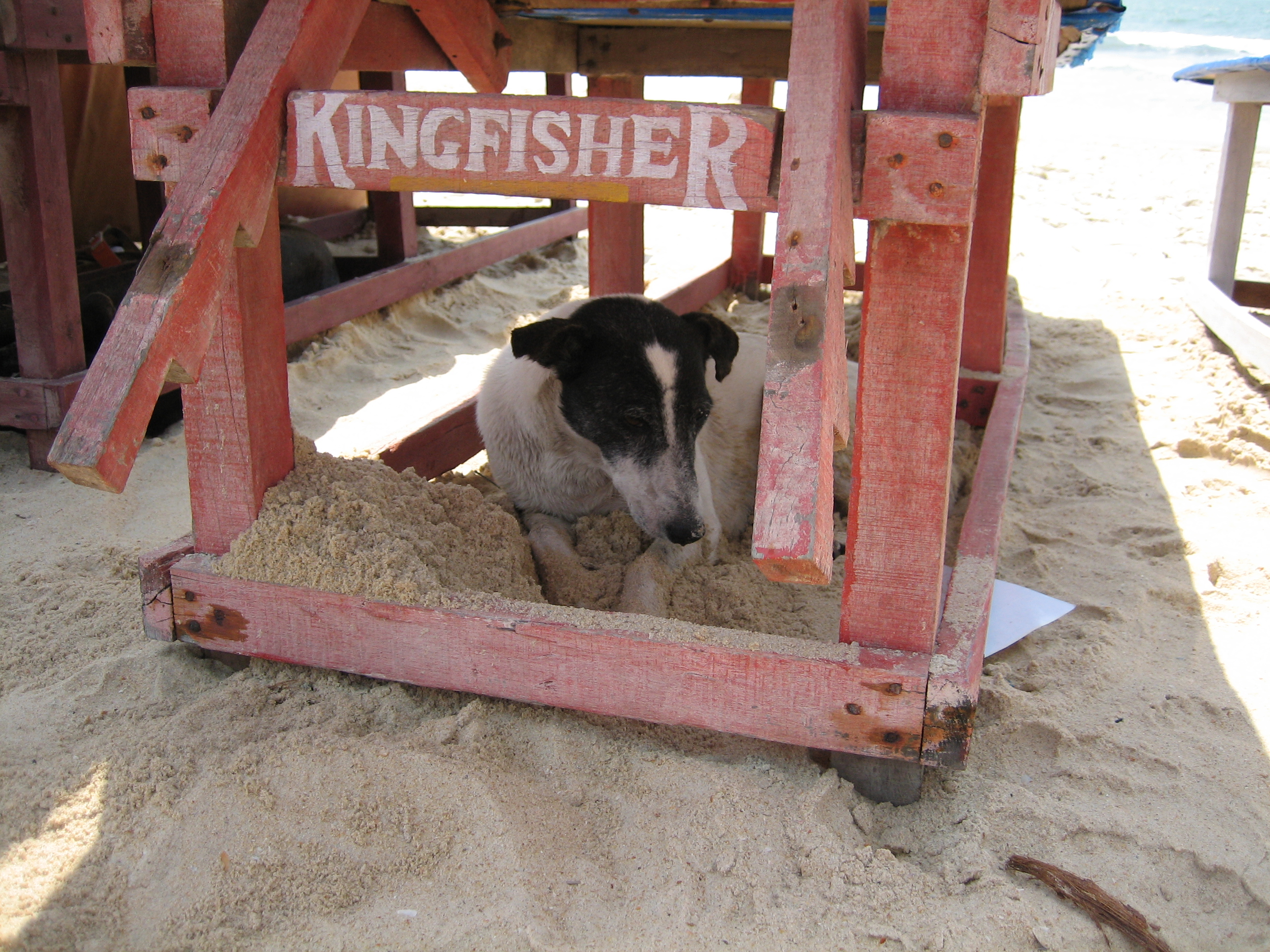 Hundar och ännu fler hundar. Var man än vänder sig så ser man hundar. En taxichaufför berättar för oss vid ett tillfälle att nästan varje familj i Goa har 2-3 hundar. Så det är väl inte så konstigt att de syns överallt. Många håller till nere vid stranden. Antagligen ser de en bra chans att få sig en bit mat där. De är inte rädda, men heller inte påflugna. En svartvit liten en har hittat skugga under min solstol. Detta är en vanlig syn. Under var och varannan solstol kan man se en nos sticka fram eller en tass nergrävd i sanden.