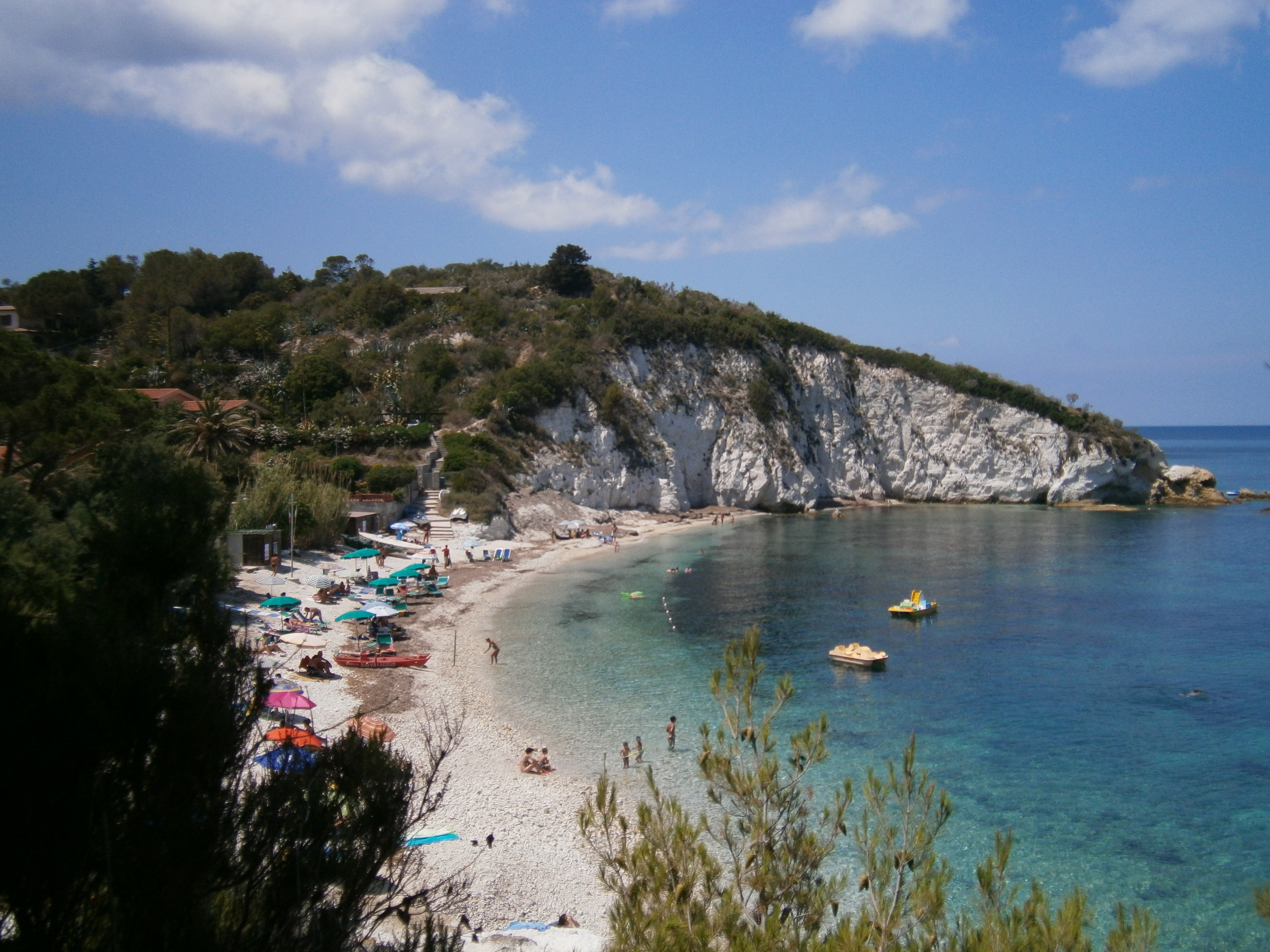 Elba har tilldelats ett pärlband av stränder längs hela kusten, i alla dess storlekar och former. Vi börjar gå på måfå från hamninloppet i Portoferraio. Vi kommer först till en större strand där vi stannar till för lunch, lite sol och bad. Men vi är inte helt nöjda, det kristallklara vattnet till trots är det mycket kommers och inte det där mysiga och gemytliga som vi hört om. Vi kan skymta tån av en kritvit klippa runt hörnet från där vi ligger och känner på oss att det finns något bättre på andra sidan. Landvägen visar sig dock vara lite längre än vad som såg ut att handla om meter sjövägen, men det är värt mödan. För vi har hittat den – den perfekta stranden.